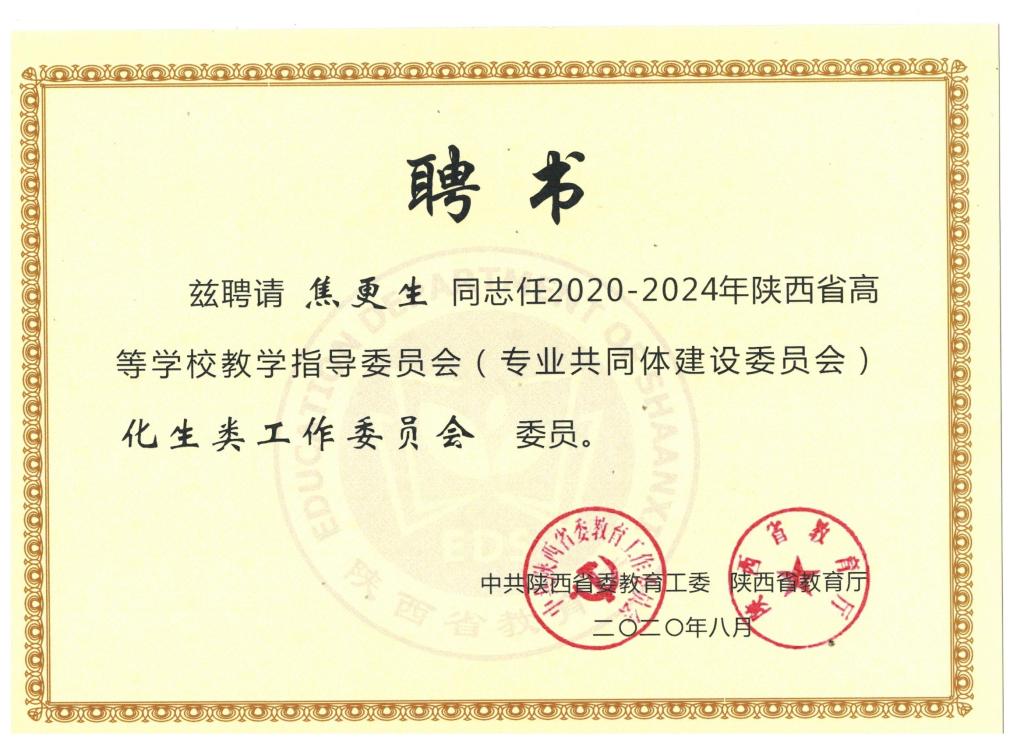 热烈祝贺公司焦更生教授获聘陕西省高等学校教学委员会化生类工作委员!