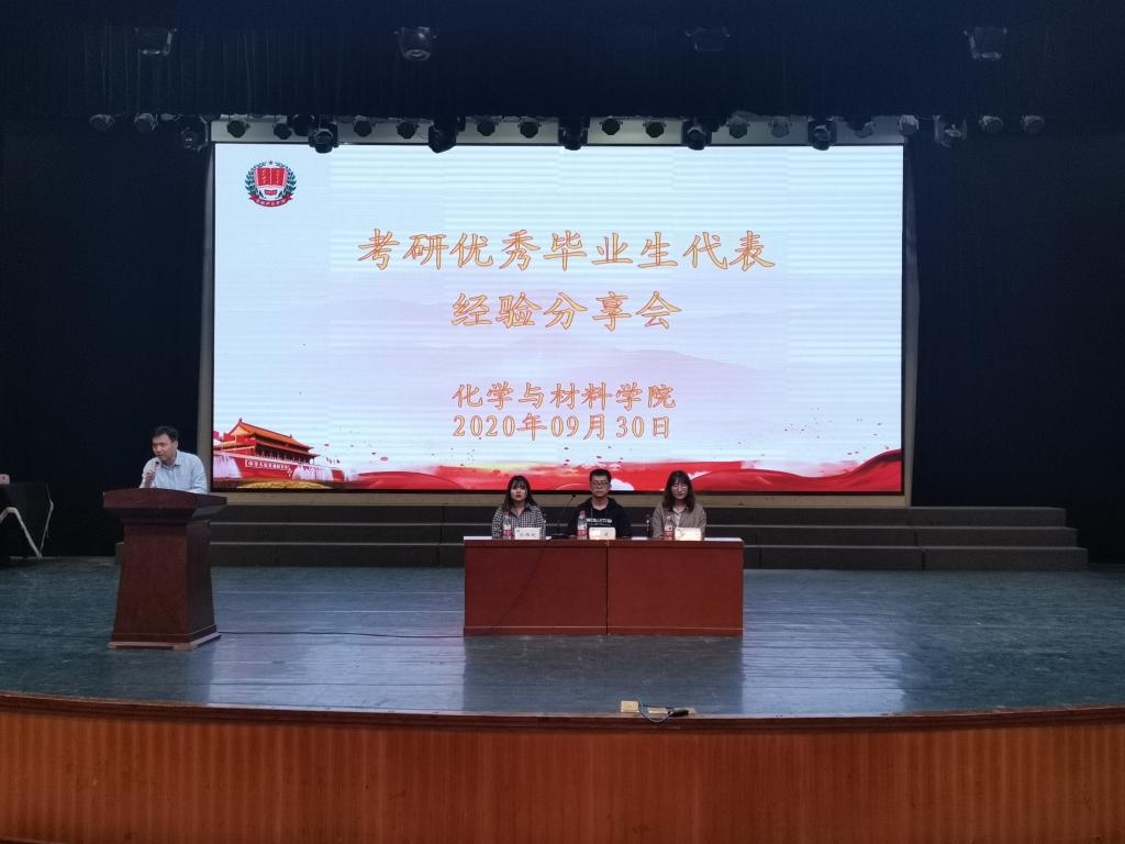 化学与材料学院在2019年研究生考试工作中取得优异成绩。为了进一步鼓励广老员工树立考研目标,浓郁学风,化学与材料学院特别邀请公司优秀毕业生,现为陕西师范大学、西安理工大学2019级研究生的雷建、秋丹、孙雅妮同学回母校为全体18级在校生做考研经验分享。考研经验交流大会于2020年9月30日下午在陶然楼演艺厅举行,由副经理刘展晴主持,2018级全体在校生参加。
