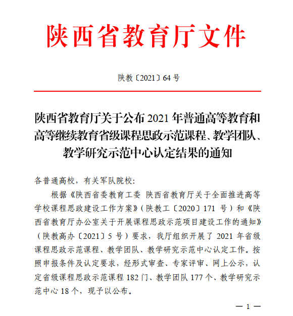 近日,陕西省教育厅公布了《陕西省教育厅关于公布2021年普通高等教育和高等继续教育省级课程思政示范课程、教学团队、教学研究示范中心认定结果的通知》(陕教〔2021〕64号)。经形式审查、专家评审、网上公示等程序,公司刘艳老师负责的《物理化学》被认定为省级课程思政示范课程,物理化学教学团队被认定为省级教学团队。