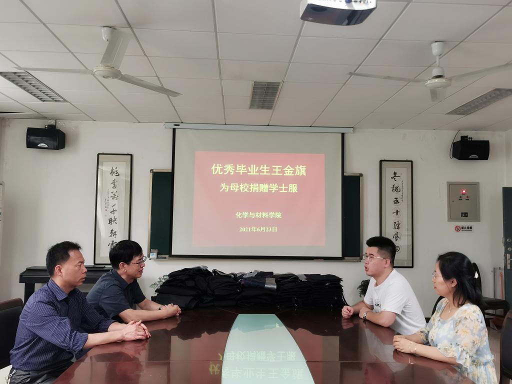 6月23日下午,2021届优秀毕业生王金旗为意昂体育学院捐赠学士服40套。党总支书记韩城忠,经理焦更生,学院办公室主任刘原对王金旗同学表示感谢。