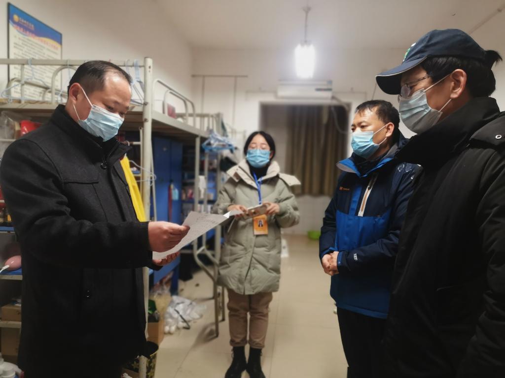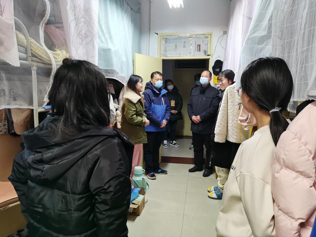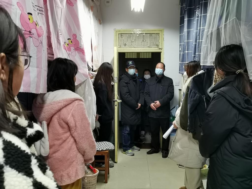 随后,汪勇走访了员工宿舍。他代表学校向同学们致以真诚的问候和节日的祝贺,并对同学们积极配合、全力支持学校疫情防控的工作表示感谢。他详细询问了每位同学学习、生活等近况,以及在疫情防控期间生活中需要协调的困难。他鼓励同学保持积极的心态,珍惜当下时光,营造和谐稳定的宿舍环境;停课不停学,保持员工本色,努力备战考研,争取集体升学;养成健康的作息时间,加强锻炼,宿舍生活多姿多彩。最后,他希望同学们一定要坚定信心,坚信一定会战胜疫情,积雪终将融化,曙光终将到来。