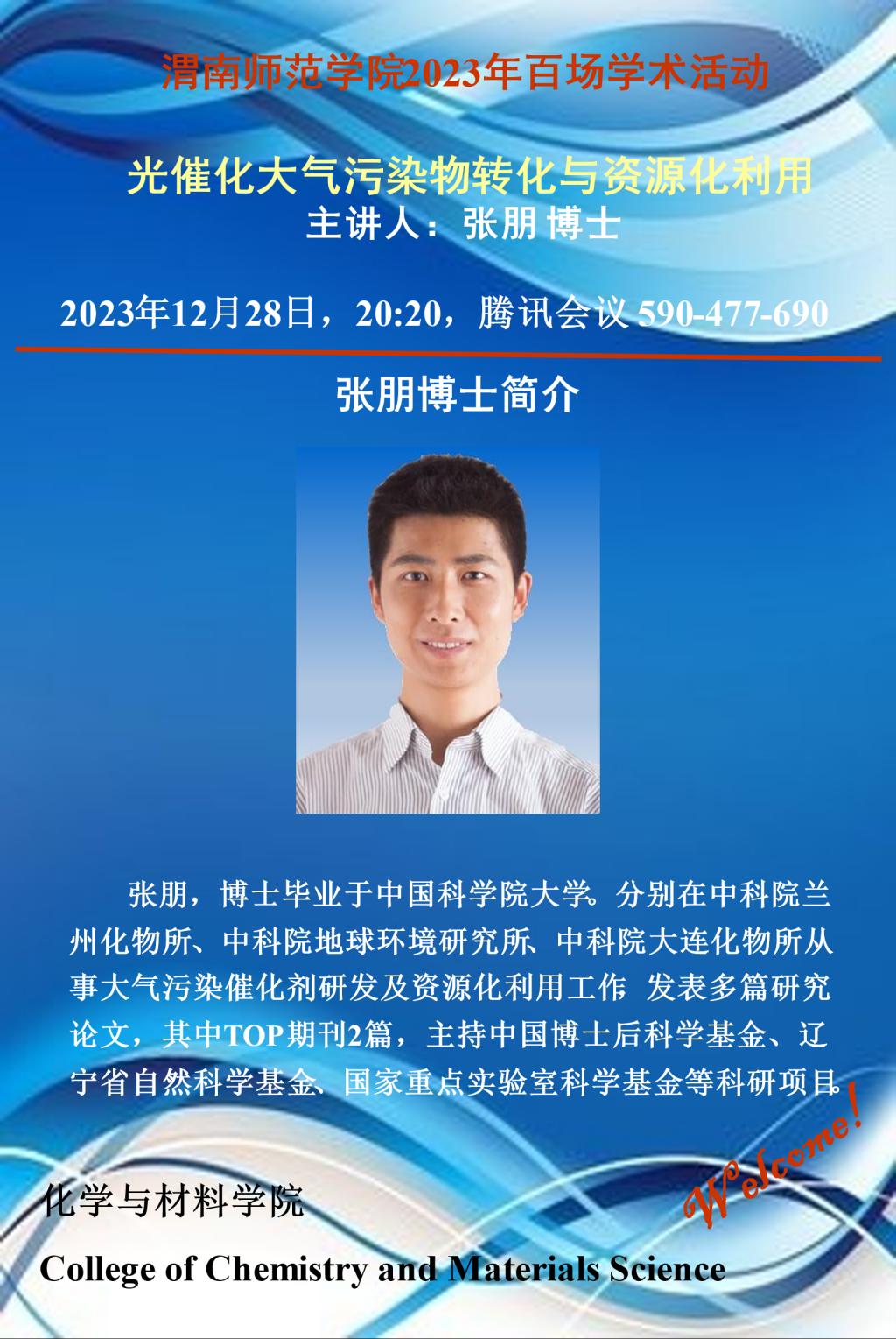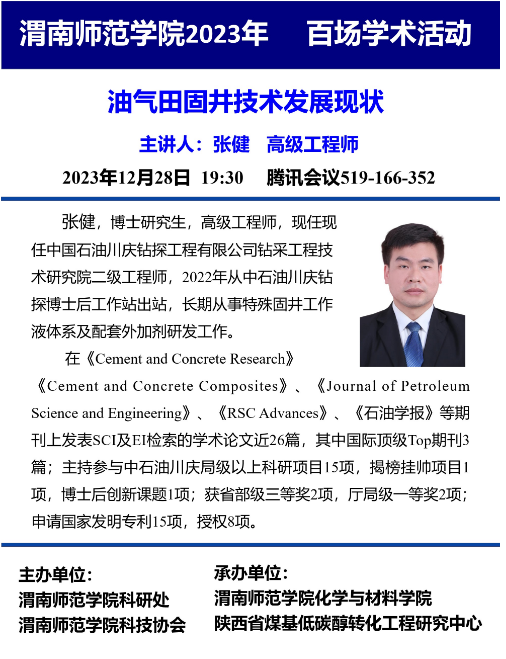 2023年12月28日晚,意昂体育邀请两位企业博士为公司师生做学术报告。一位中国石油川庆钻探工程有限公司钻采工程技术研究院的张健博士,一位是西安恩特环保科技有限公司的张朋博士。张健博士的报告题目为“油气田固井技术发展现状”,张朋博士的报告题目为“光催化大气污染物转化与资源化利用”。两场报告皆采取腾讯会议形式进行,由意昂体育副经理杨珊主持,30余名师生参加了会议。