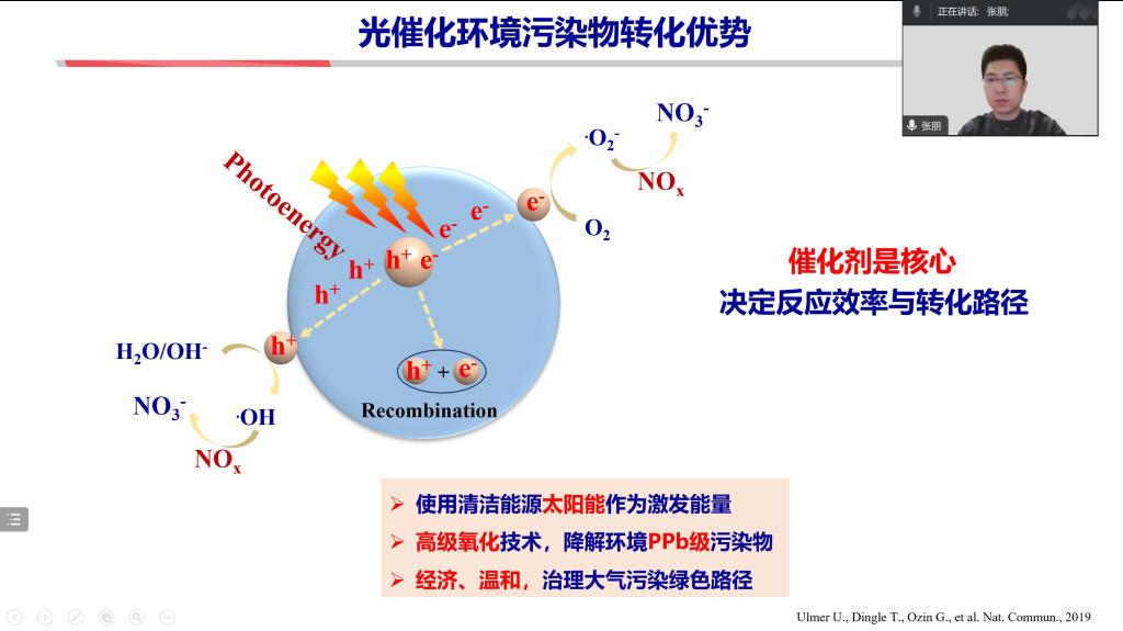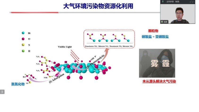 张朋博士从大气污染现状出发,结合西安的污染物特点和地域特质,讲述了解决西安大气污染的思路,设计并应用了太阳能净化系统和空气净化路灯用于雾霾的治理,详细介绍了核心的光催化材料的设计思路并应用于污染物转变成有用的有机小分子和药物。张朋博士的报告深入浅出、理论结合实际,向我们展示了光催化大气污染物转化及资源化利用的前沿进展,为光催化器件的研发设计及污染物资源化利用提供了理论和技术指导。