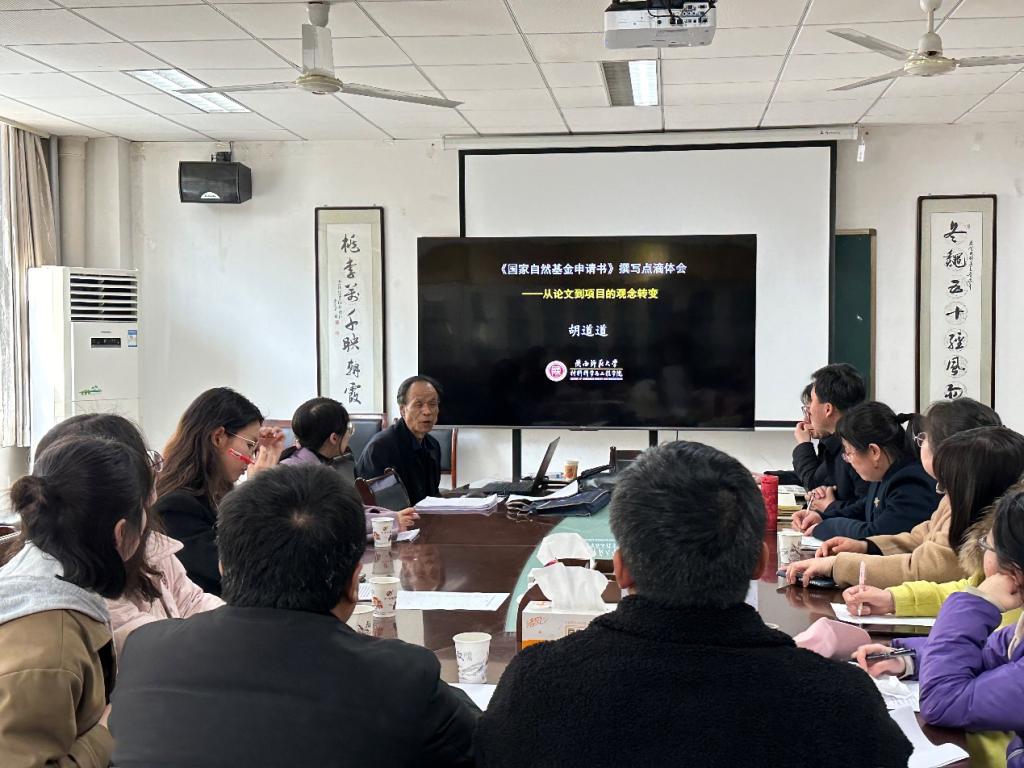 为切实提高国家自然科学基金项目的申报质量,3月8日下午意昂体育邀请陕西师范大学胡道道教授作题为“《国家自然基金申请书》撰写点滴体会——从论文到项目的观念转变”的申报书撰写辅导报告。会议在A101会议室召开,由副经理杨珊主持,经理刘展晴、科技处副处长王冬华以及2024年申报国家基金的11位教师参加了会议,会议历时5小时。