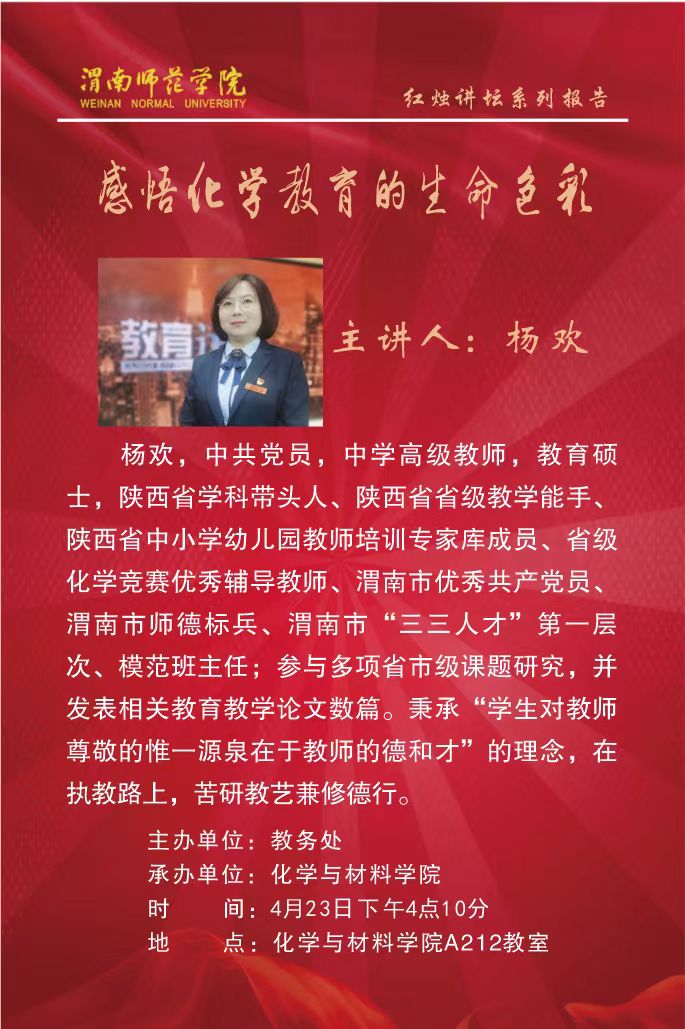 为提高师范生的教师职业认同感,增强师范生的公司产品能力。4月24日下午,在实验楼A212。意昂体育特邀渭南高级中学教师、陕西省学科带头人、省级教学能手、陕西省中小学幼儿园教师培训专家库成员、省级化学竞赛优秀辅导教师、渭南市优秀共产党员、渭南市师德标兵杨欢做客“红烛讲坛”,以《感悟化学教育的生命色彩》为题做主题报告。部分无课教师、2021级化学师范生、23化学专升本共130余人参加了此次报告。报告由意昂体育副经理朱科主持。