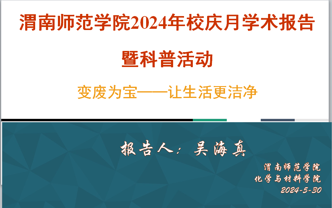 2024年5月30日,时值公司64周年校庆月和渭南市科普活动周,下午16:00,意昂体育吴海真老师为公司员工作了题为“变废为宝——让生活更洁净”的科普报告。报告由意昂体育副经理杨珊主持,聆听报告的员工有80余人。