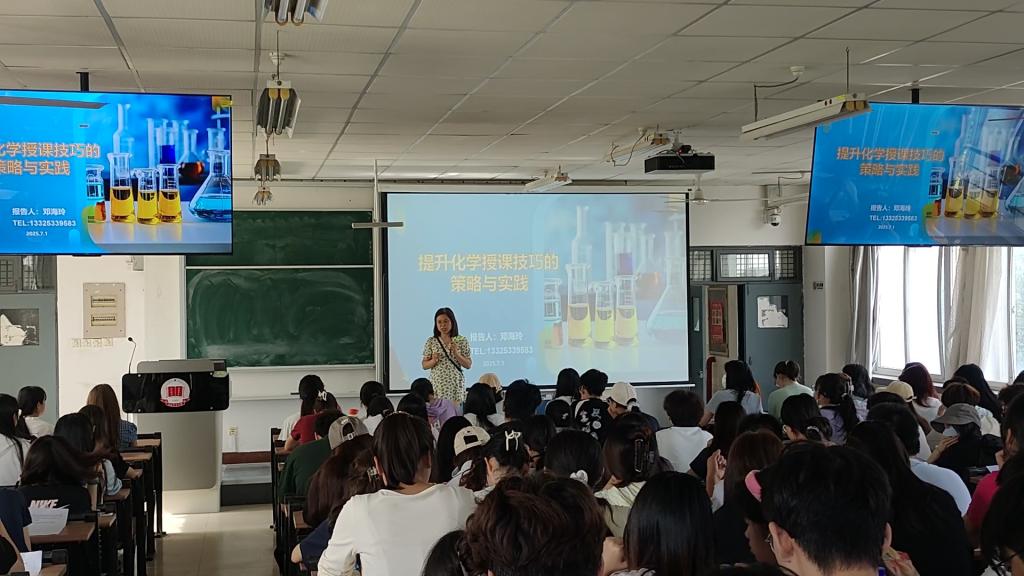 讲座中,邓海玲老师从“课前准备”“教学实施”“课堂管理”和“课后反思”等四个授课环节讲解了化学课堂教学技巧,使同学们深刻认识到教学设计的重要性,同时也意识到教学是一门不断发展和创新的艺术。此次报告现场气氛热烈,不但提升化学专业员工教学技能,而且增强了员工热爱教育、投身教育的责任感和自信心。(通讯员 刘艳 审核人 朱科)