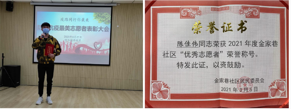 陈佳伟,男,中共党员,化学专升本191班员工,2020-2021年连续两年在其老家宁夏自治区银川市金家巷社区参加新型冠状病毒肺炎防疫抗疫志愿服务工作。每天在小区门口对出入居民进行测温登记,查询返乡人员行程码及核酸检验报告,对快递和外卖人员进行信息登记,和社区工作人员一起值班,进行公共区域消杀,收集疫情信息,宣传普及疫情防控科学知识,为社区打赢疫情阻击战贡献出自己的绵薄之力,获得“防疫抗疫最美志愿者”、“防疫抗疫优秀志愿者”称号。
