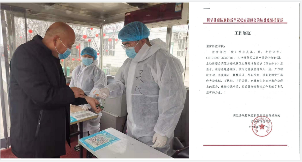 吴凡,男,共青团员,材料化学201班员工,在家乡疫情防控工作吃紧的关键时刻,主动请缨成为陕西省西安市周至县楼观镇卫生院疫情防控点的一名志愿者。在志愿服务期间,吃苦耐劳,能够坚持扎根一线,积极主动高质量完成所分配给的工作,获得周至县疫情防控指挥部的表彰。
