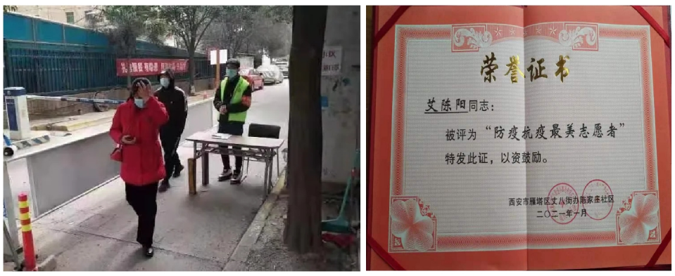 艾陈阳,男,共青团员,能源化学工程191班员工,2021年寒假期间,积极投身于西安市雁塔区陈家庄社区新型冠状病毒肺炎防疫抗疫志愿服务的工作中。在社区防控小组的安排下,每天准时到防控点义务执勤,并对防控点进行消毒,对进出小区的人员及来往车辆进行消毒登记,参与联防联控、群防群治,工作中冲锋在前、吃苦耐劳,被所在社区评为“优秀青年志愿者”。